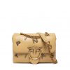 Сумка Mini Love Bag Puff из мягкой кожи наппа, украшенная металлическими значками-буквами, образующими надпись «Pinko Ti Amo». Застежка дополнена легендарной металлической пряжкой Love Birds с гальваническим покрытием «античное золото». Внутри сумка обшита микрофиброй, разделена карманом-перегородкой на молнии и снабжена карманом на стенке. Плечевой ремень длиной 110 см представляет собой комбинацию классической металлической цепочки с круглыми звеньями и практичного наплечника из кожи наппа.